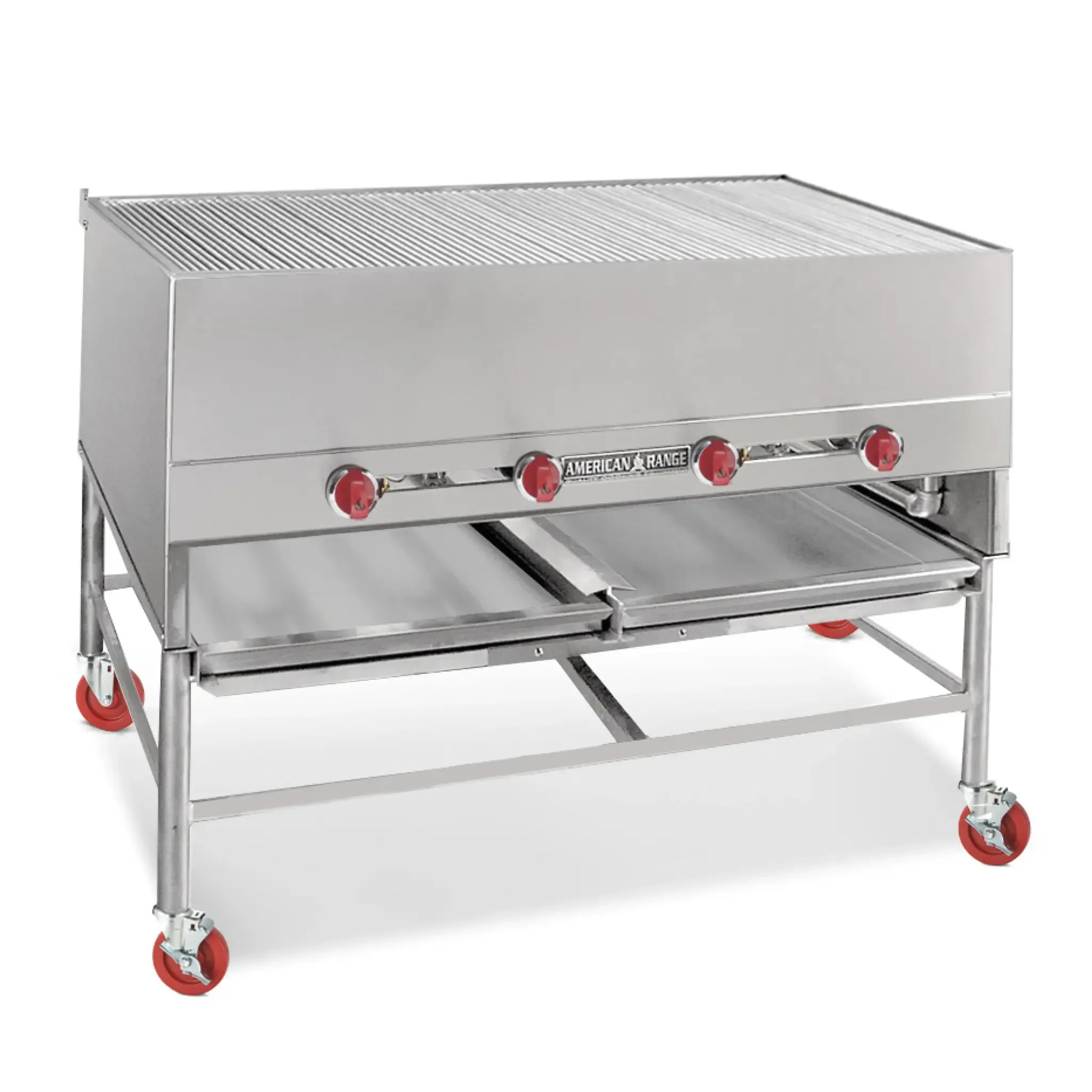 Cook with passion and embrace culinary excellence with the American Range AHS-6027 Charbroiler. This gas-powered, floor model charbroiler is designed specifically for commercial restaurant use, making it the perfect addition to any professional kitchen. With a generous 60" width and five burners, this charbroiler provides ample cooking space to handle high-volume demands. The round rod non-stick top grates ensure even heat distribution and prevent food from sticking, while the open bottom grate design allows for easy cleaning. Made in the USA with a durable stainless steel exterior, this charbroiler is built to withstand the rigors of a busy kitchen. With a powerful 59.0kW and 200,000 BTU, this charbroiler delivers exceptional cooking performance. Trust American Range, a reputable vendor in the industry, and elevate your restaurant's grilling capabilities with the AHS-6027 Charbroiler.