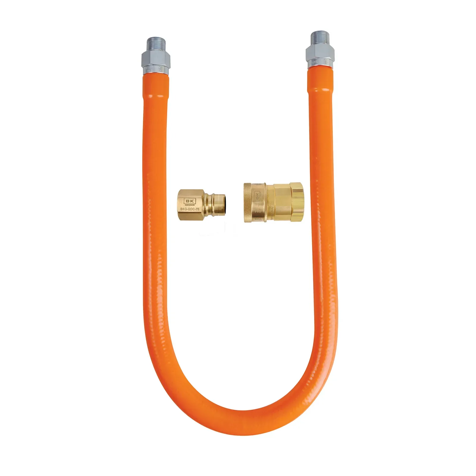 Introducing the BK Resources, BKG-GHC-7524-QD-PT Gas Connector Hose Kit, designed to drive restaurant profitability. This kit includes a 24" long stainless steel hose with a 3/4" I.D., featuring a radial wrap and protective translucent coating for durability and safety. The gas hose quick disconnect connection ensures easy installation and maintenance. With its cCSAus certification, you can trust the quality and reliability of this kit.