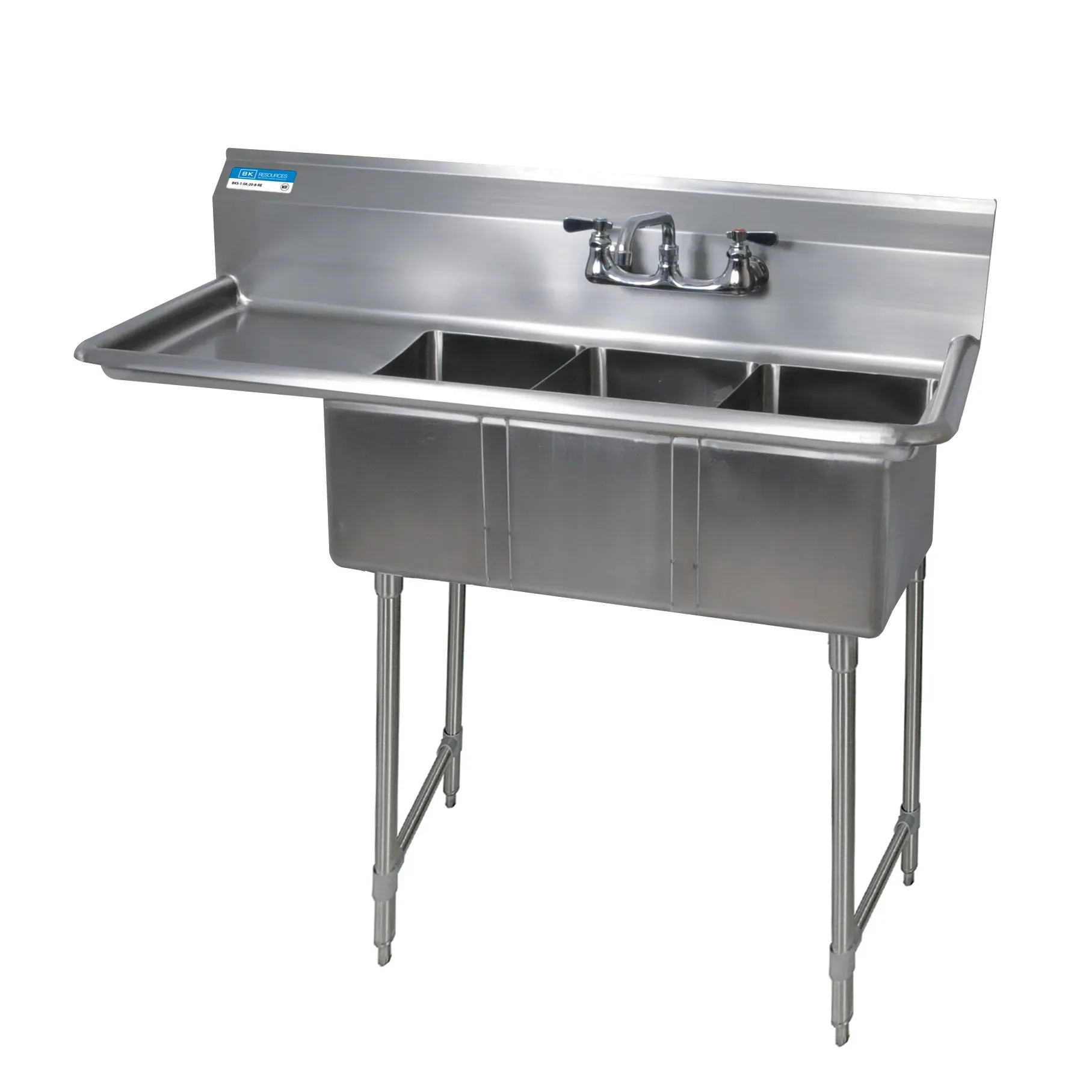 Unleash culinary creativity with the BK Resources, BKS-3-1014-10-15LS Sink. This three-compartment convenience store sink is designed to meet the demands of a busy commercial restaurant. With its 47-1/2" width, 19-13/16" depth, and 39-3/4" height, it provides ample space for washing, rinsing, and sanitizing dishes. The 10" wide x 14" front-to-back x 10" deep compartments are perfect for accommodating large pots, pans, and utensils. The 15" drainboard on the left offers additional workspace for food preparation. The sink features 1-1/2" rolled edges on the front and sides, ensuring durability and preventing spills. It comes with basket drains for easy waste disposal. Made of 18/304 stainless steel, the deck, bowl, legs, and side crossbracing are built to withstand heavy use. The stainless steel over plastic adjustable bullet feet provide stability and easy leveling. NSF certified, this sink guarantees hygiene and safety in your commercial kitchen. Upgrade your restaurant's efficiency and functionality with the BK Resources, BKS-3-1014-10-15LS Sink.