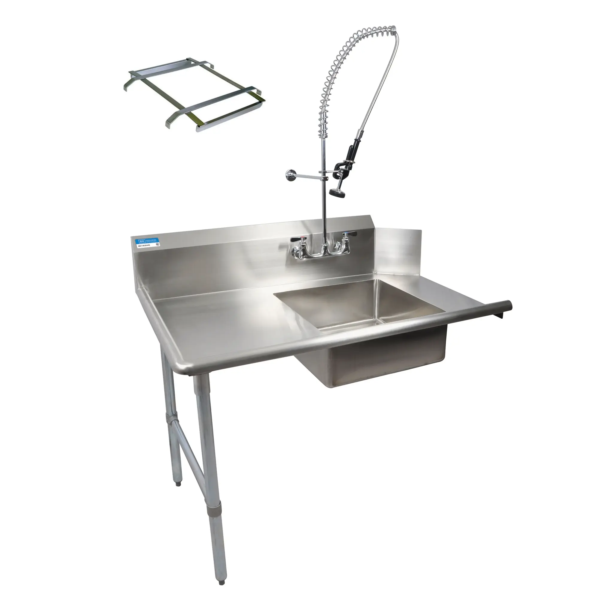 Cooking at its finest begins with the BK Resources BKSDT-26-L-P2-G Dishtable. Designed for commercial restaurant use, this soiled dishtable is a must-have for any busy kitchen. The straight design and 18/304 stainless steel top ensure durability and easy cleaning, while the 10-inch high backsplash and raised rolled edges on the front and sides prevent spills and splashes. The dishtable features a 20" x 20" x 8" deep pre-rinse sink, perfect for efficiently rinsing dishes before washing. With an 8" OC splash mount pre-rinse faucet and a basket drain included, this dishtable offers convenience and functionality. The galvanized legs and side bracing provide stability, and the high impact corrosion resistant adjustable bullet feet ensure a level surface. NSF approved, this dishtable meets the highest standards of cleanliness and sanitation. Upgrade your restaurant kitchen with the BK Resources BKSDT-26-L-P2-G Dishtable and experience the difference in efficiency and performance.