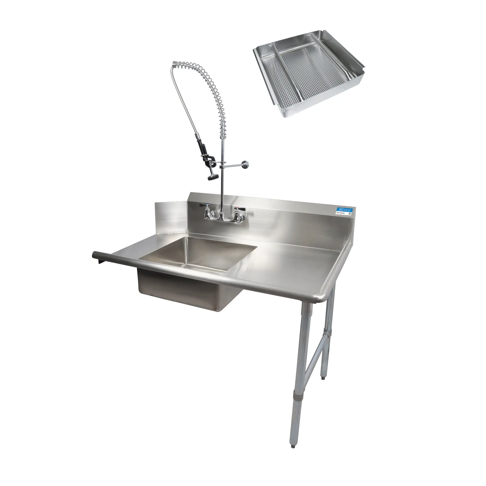 Empower your kitchen staff with the BK Resources BKSDT-60-R-P3-G Soiled Dishtable. This straight design dishtable is perfect for commercial restaurant use, offering a spacious 60"W x 30-3/8"D x 46-1/4"H size. The 18/304 stainless steel top ensures durability and easy cleaning, while the 10"H backsplash and raised rolled edges on the front and sides prevent spills and splashes. The right-to-left operation allows for efficient workflow, and the 20" x 20" x 8" deep pre-rinse sink with an 8" OC splash mount pre-rinse faucet makes it easy to rinse off dishes and utensils. The dishtable also includes a pre-rinse basket and basket drain for added convenience. With galvanized legs and side bracing, as well as high impact corrosion resistant adjustable bullet feet, this dishtable is built to withstand the demands of a busy commercial kitchen. Trust BK Resources for quality and reliability.