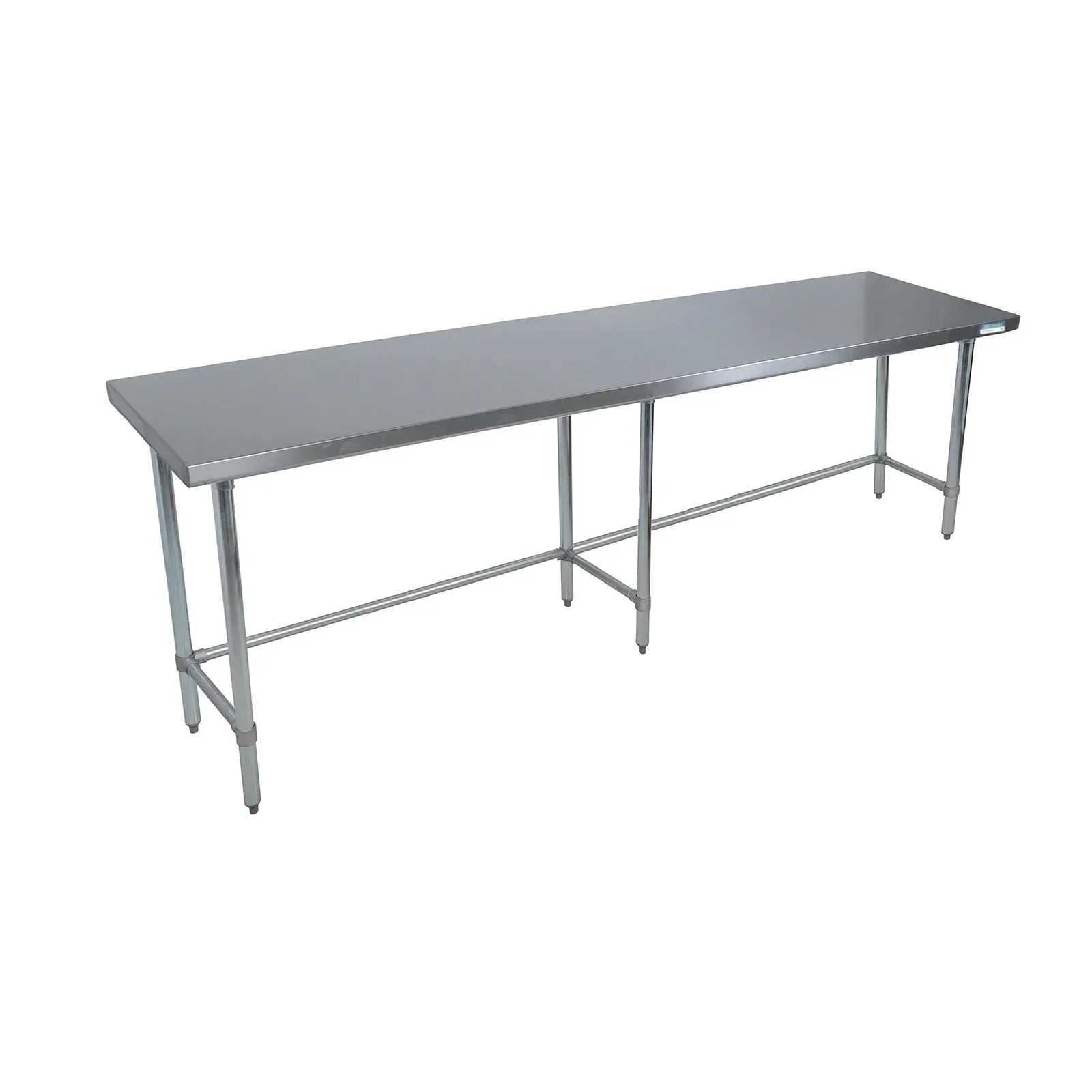 Empower your kitchen staff with the BK Resources SVTOB-9630 Work Table. This durable and versatile work table is designed to meet the demands of a busy commercial restaurant. The 18/430 stainless steel top with turndown edges on all sides provides a sturdy and hygienic surface for food preparation. Reinforced with channels and supported by stainless steel side and rear bracing, this work table is built to withstand heavy use. The open base design allows for easy access and storage of kitchen essentials. The 1-5/8" diameter stainless steel legs provide stability, while the stainless steel over plastic adjustable bullet feet ensure level placement on any surface. With its NSF certification, you can trust that this work table meets the highest standards of cleanliness and safety. Upgrade your kitchen with the BK Resources SVTOB-9630 Work Table and experience enhanced efficiency and productivity.