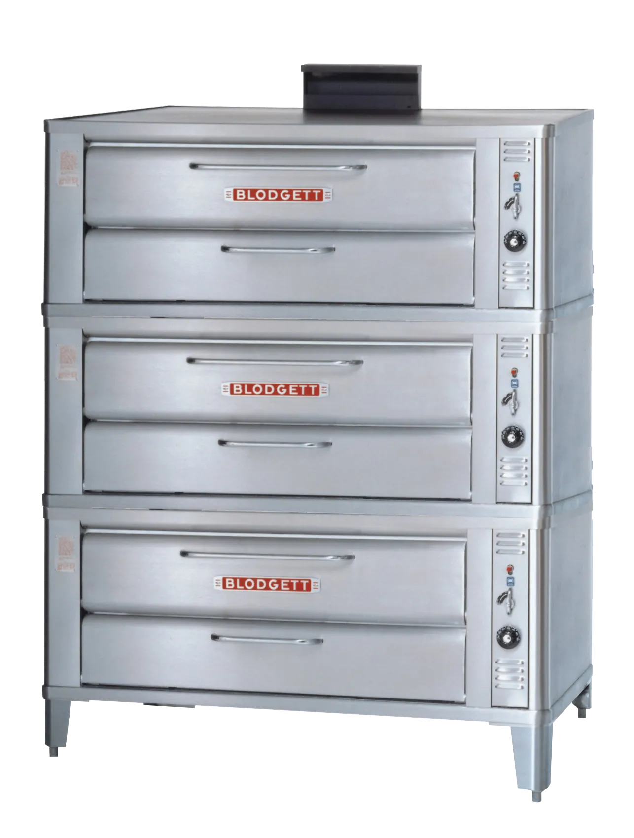 The Blodgett Deck Oven line has set industry wide standards for excellence in baking characteristics, performance and reliability. Simplicity of design and quality construction throughout assure years of trouble-free operation. Blodgett provides the strongest warranty in the business with a standard five-year door warranty! Creating endless possibilities with the Basic Four! The Blodgett large 900 Series gas deck ovens come in four basic sections. Each section has the same 60″ x 40″ footprint and can be stacked in any combination. The possibilities are endless. Separate heat controls for each section permit baking and roasting at different temperatures, simultaneously, in one oven! Blodgett’s Basic Four design gives you the ultimate in versatility, efficiency, and economy. 961-TPL is a triple stack oven with three 7” high baking compartment and includes 7” adjustable s/s legs, s/s draft diverter or direct vent, crown angle trim and triple gas connector