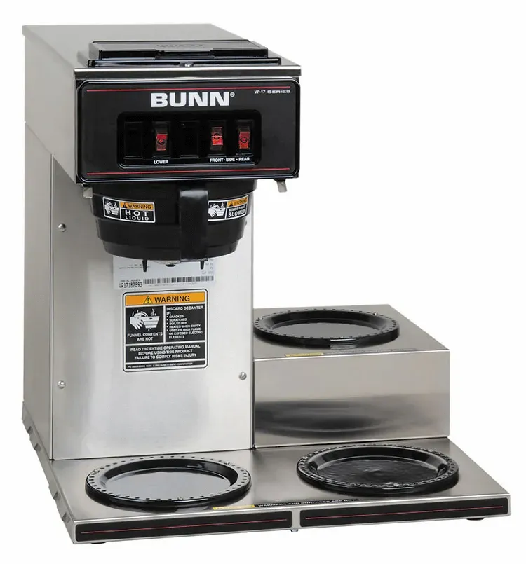 Introducing the Bunn 13300.0003 Coffee Brewer for Decanters, designed to modernize your restaurant's coffee-making process for efficiency and excellence. This pour-over type coffee maker boasts a remarkable brewing capacity of 3.8 gallons per hour, ensuring a steady supply of delicious coffee for your customers. Equipped with three lower warmers, it allows you to keep multiple decanters of coffee hot and ready to serve. The plastic funnel and stainless decor not only add a touch of elegance to your establishment but also make cleaning a breeze. With a power rating of 120v/60/1-ph and 1670 watts, this coffee brewer is built to handle the demands of a busy commercial restaurant. It is UL and NSF certified, guaranteeing its safety and quality. Upgrade your coffee service with the Bunn 13300.0003 Coffee Brewer for Decanters and elevate your customers' dining experience.