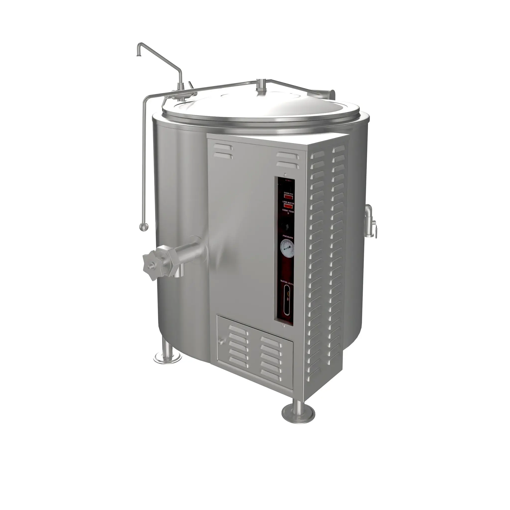 The GL-20E, GL-30E, GL-40E, and GL-60E kettles are designed for reliable performance and ease of use, featuring electronic ignition and a spring-assisted hinged cover for convenient operation. These kettles are constructed with a durable type 304 stainless steel exterior finished with a #4 sanitary finish and supported by 6” (152mm) stainless steel adjustable legs for stability and easy leveling. The interior of the kettle is crafted from a one-piece welded construction of type 316 stainless steel with a #4 sanitary finish. With 2/3 jacketed construction, the kettle ensures efficient heat distribution for consistent cooking results. A 2” (50 mm) tangent draw-off valve with strainer comes standard for easy draining. The recessed control panel, positioned on the front side of the unit for easy access and visibility, includes intuitive controls. Standard features include a direct immersion thermostat, water sight glass, cooking light, pressure gauge, and a low water indicator light. For safety, the kettle is equipped with a low water cut-off, pressure relief valve, pressure switch, and a 100% safety gas shutoff valve, ensuring safe and efficient operation. A faucet bracket is also included for added convenience.