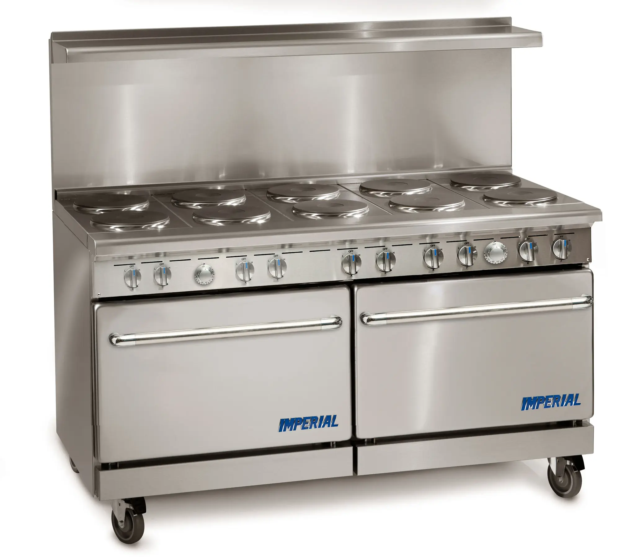 Imperial Electric Range - 60" wide with (10) round elements and two standard ovens base. Round elements are 2.6 kw with clean flat surface. Each Standard oven 5kw elements provide even heating. Heavy duty thermostat temp range 150 deg to 500 deg. comes with one chrome oven rack