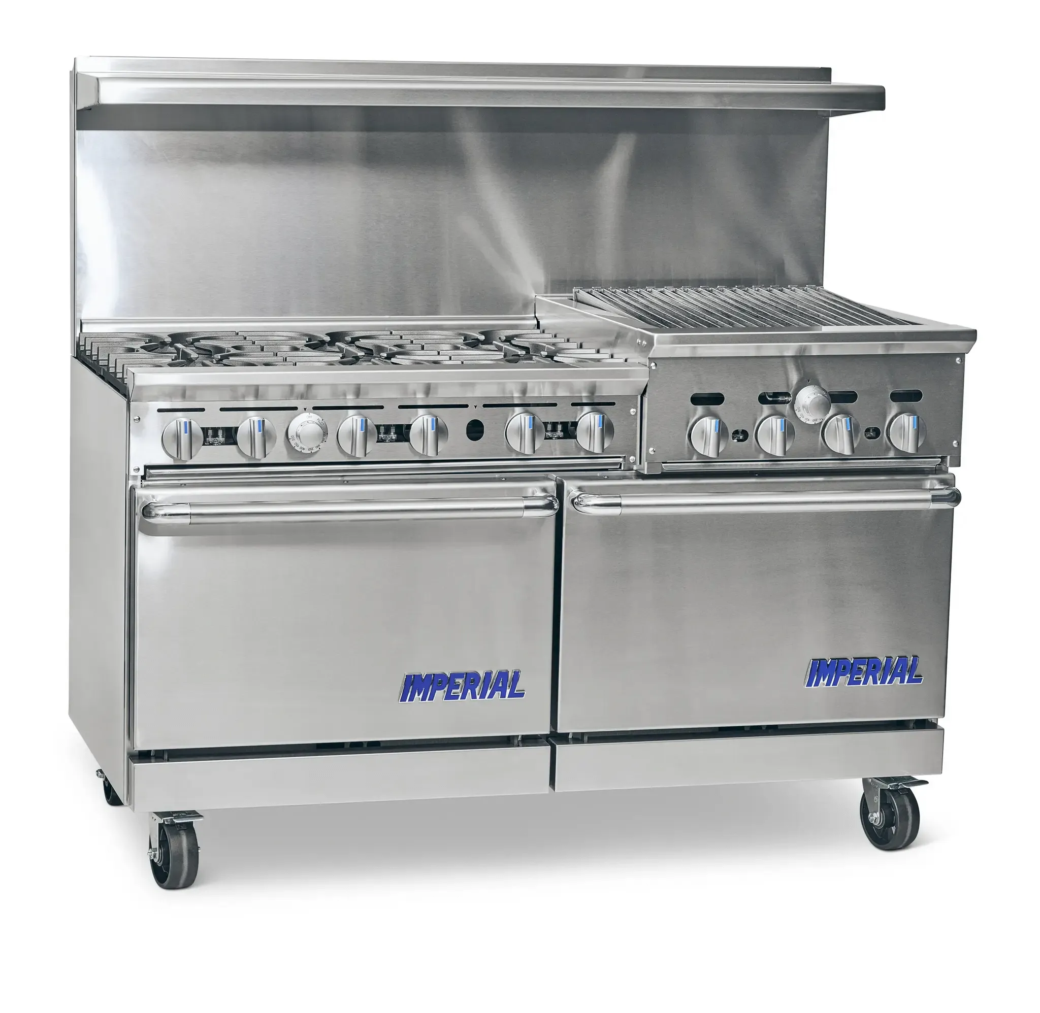 60" Wide Restaurant Range with (6) Pyrocentric 32,000 BTU Anti-clogging burners, (1) 24" 15,000 BTU radiant broiler with (1) open cabinet and (1) standard oven