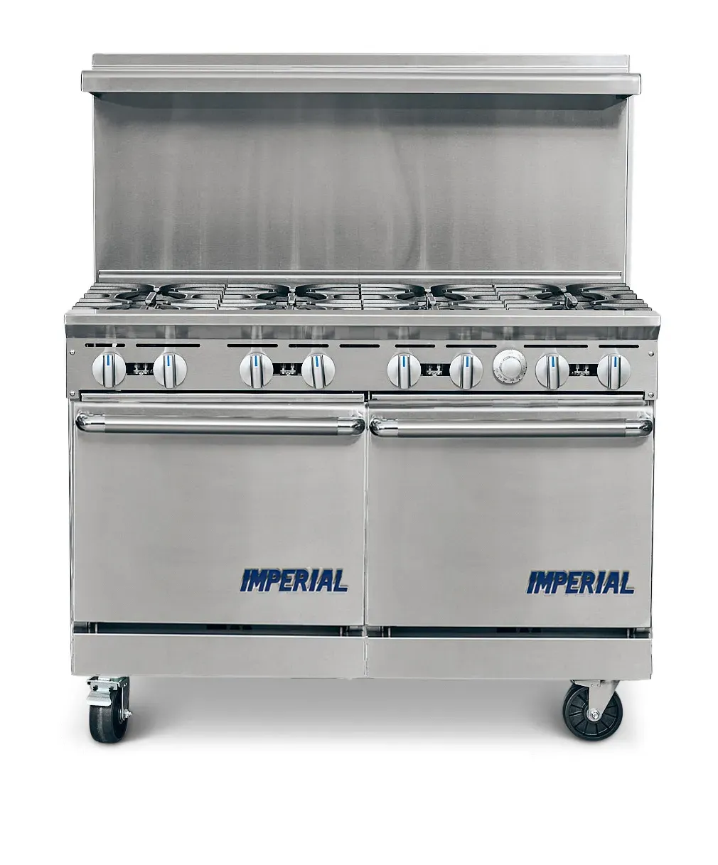 Unleash gastronomic brilliance with the Imperial IR-8 Range, a 48" gas restaurant range that is designed to elevate your culinary creations to new heights. This range features 8 open burners, allowing you to simultaneously cook multiple dishes with precision and efficiency. The 2 space saver ovens provide ample space for baking, roasting, and broiling, while the chrome rack in each oven ensures even heat distribution for perfectly cooked meals every time. The removable crumb tray makes cleaning a breeze, saving you valuable time in a busy restaurant kitchen. Crafted with a stainless steel front, sides, backguard, shelf, landing ledge, and kick plate, this range is not only durable but also adds a touch of elegance to your kitchen. With 6" legs and adjustable feet, you can easily customize the height to suit your needs. With a powerful 310,000 BTU, this NSF, CE, CSA Flame, and CSA Star certified range is a reliable and efficient addition to any commercial restaurant. Elevate your culinary game with the Imperial IR-8 Range.