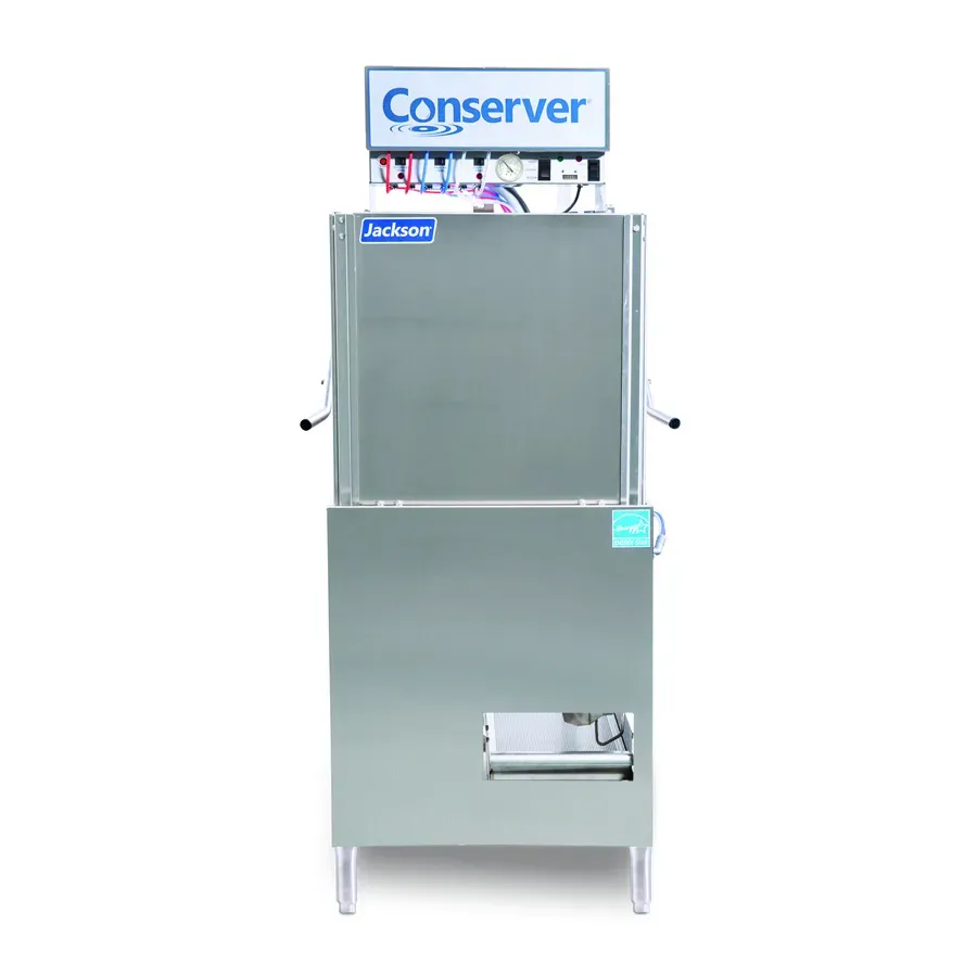 Equip your kitchen with innovative solutions using the Jackson WWS CONSERVER XL-E-LTH Dishwasher. This door-type dishwasher is designed specifically for commercial restaurant use, offering efficiency and convenience. With dimensions of 30-1/8"W x 29-1/2"D x 68-1/2"H, it fits perfectly in any kitchen layout. The low temperature chemical sanitizing feature ensures that your dishes are thoroughly cleaned and sanitized, while the built-in booster heater provides optimal water temperature for effective washing. With three selectable timed cycles and a capacity of approximately 39 racks per hour, this dishwasher can handle high-volume operations with ease. The built-in dispensing pumps and scrap accumulator make the cleaning process even more efficient. Made of stainless steel construction, this dishwasher is durable and easy to clean. It is also ENERGY STAR certified, ensuring energy efficiency and cost savings. Upgrade your restaurant's dishwashing capabilities with the Jackson WWS CONSERVER XL-E-LTH Dishwasher.