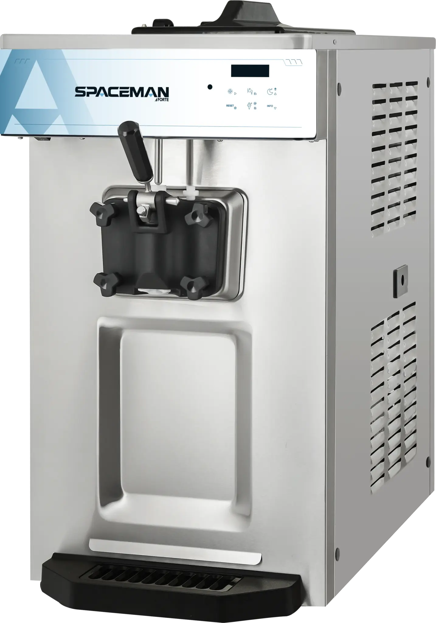 The 6236A-C is a high-volume single flavor countertop, pressurized (air pump) soft serve machine built for operators who demand maximum performance and product quality. With patented freezing technology on its 3.4qt cylinders, the 6236A-C delivers industry-leading initial freeze times, rapid recovery, and the ability to produce over 350 4oz servings per hour—making it one of the fastest, most efficient machines available. Ideal for high-volume operations with servings up to 12oz, it produces a variety of soft serve products including ice cream, frozen yogurt, custards, and sorbets. At the heart of its performance is Spaceman’s patented 100% Controlled Contact Flooded Evaporator, engineered for maximum efficiency and delivering the industry’s smoothest, creamiest mouthfeel with smaller ice crystals and faster freeze-down. Continuous improvements in design, driven by operator feedback and R&D, ensure greater structural integrity, easier serviceability, and reduced failure rates. The advanced V5 single-piece auger eliminates unnecessary parts, reduces cleaning time, ensures full evaporator wall contact, and enhances consistency with the smallest ice crystals in the industry. Smart safety controls and independent standby modes maintain hopper and cylinder temperatures below 4.4ºC (40ºF), optimizing product quality and energy efficiency during non-use. Inverter motor control further enhances durability by allowing three-phase motors to run on single-phase power input, reducing torque and start-up strain and significantly minimizing gearbox and drivetrain failures caused by freeze-ups or operational errors. The 6236A-C features Spaceman’s advanced pressurized air pump system, designed for compatibility with a wide range of products and engineered with fewer parts for easier use, cleaning, and maintenance. Its oversized pump and control system keep the freezing cylinder consistently full to prevent product starvation while allowing operators to choose between six adjustable overrun settings. This flexibility lets users create creamier, fluffier, lighter products while maximizing profitability. Hopper agitators keep mix stirred throughout the day for consistent dairy-safe cooling, and the increased 5-gallon hopper capacity allows for larger batch mixing and fewer refills, improving efficiency and ease of operation.