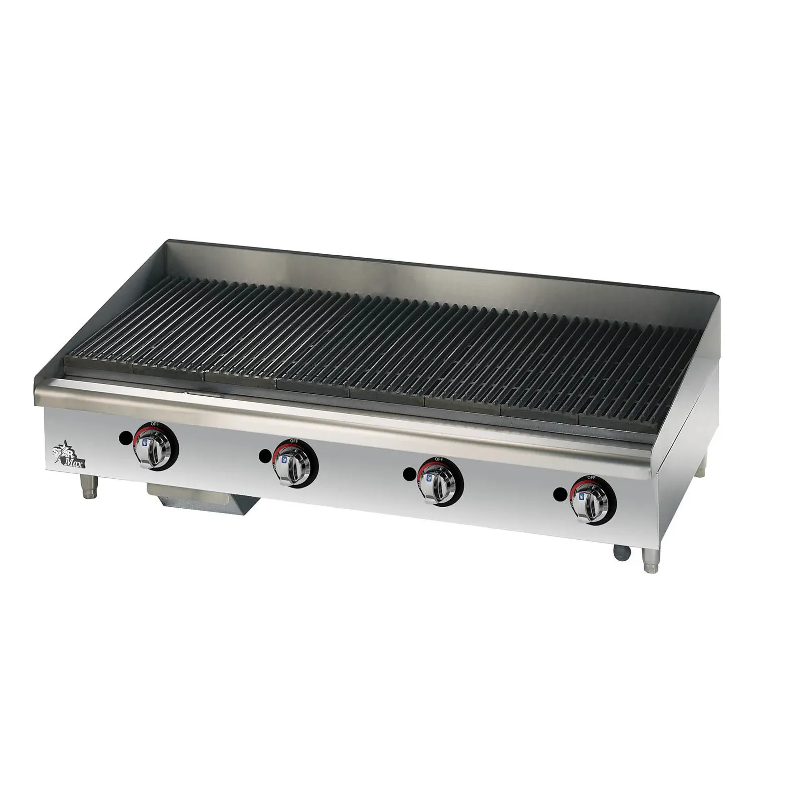 Introducing the Star 6048CBF Gas Countertop Charbroiler, the perfect addition to any commercial restaurant kitchen. With its culinary excellence in every dish, this charbroiler is designed to deliver exceptional results. The 48" wide cast iron burners provide a powerful 40,000 BTU each, allowing for precise heat control and even cooking. The adjustable manual controls every 12" ensure that you can easily customize the heat intensity for different types of food. The lava rock briquettes enhance flavor and provide even heat distribution, while the cast iron broiling grates create beautiful grill marks. The welded steel frame with a stainless steel top and front, along with aluminized steel sides, ensures durability and easy cleaning. The stainless steel water pan, splash guard, and grease trough make maintenance a breeze. With 4" legs for stability and a total of 160,000 BTU, this charbroiler is cULus and UL EPH certified. Trust the Star 6048CBF Gas Countertop Charbroiler to elevate your culinary creations and impress your customers.