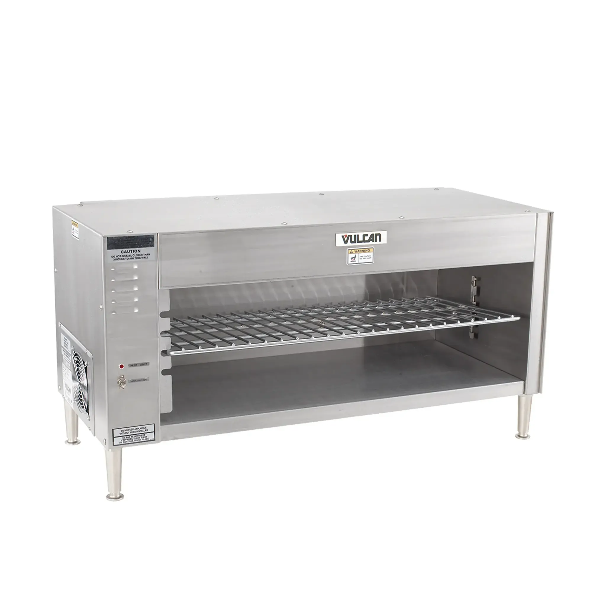 Enhance the heart of your restaurant with the Vulcan 1036 Cheesemelter. This electric cheesemelter is designed to meet the demands of a busy commercial kitchen. With its solid state controls and quartz infrared tube heating elements, it provides precise and efficient heating for melting cheese and browning dishes. The 36-1/2" size and four rack positions allow for versatile cooking options, accommodating a variety of dishes. The stainless steel exterior and interior finish not only give it a sleek and professional look but also make it durable and easy to clean. Whether you need to melt cheese on top of a dish or give it a golden crust, this Vulcan cheesemelter is up to the task. It comes with 4" adjustable legs for countertop installation or a wall mounting panel, giving you flexibility in your kitchen layout. Trust Vulcan to deliver high-quality equipment that enhances the efficiency and productivity of your restaurant.