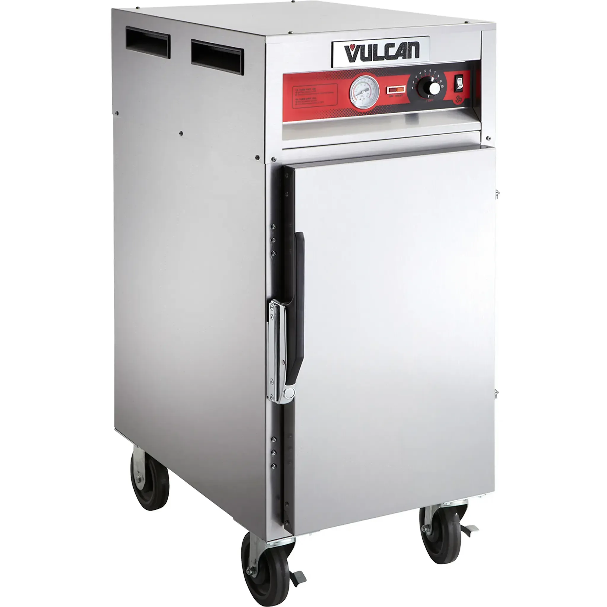 Experience kitchen innovation with the Vulcan VHP7 Heated Cabinet. This mobile cabinet is designed to meet the needs of commercial restaurants, offering convenience and efficiency. With a capacity of 7 steam table pans measuring 12" x 20" x 2-1/2", this cabinet allows for easy storage and transport of hot food items. The fixed racks, spaced 3" apart, ensure optimal organization and accessibility. The side-mounted carrying handles make it easy to move the cabinet around the kitchen or dining area. The recessed control panel and dial thermostat, adjustable from ambient to 190 F, provide precise temperature control for keeping food warm and ready to serve. Made with a 20-gauge stainless steel interior and exterior, this cabinet is durable and easy to clean. Trust Vulcan for quality and reliability in your commercial kitchen.